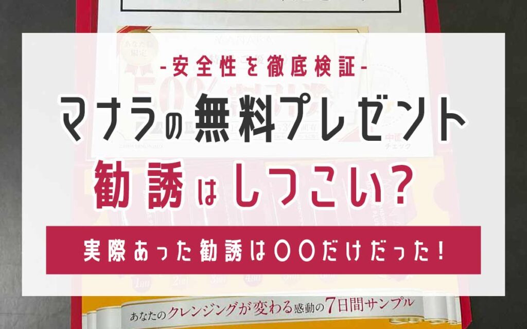 マナラの無料プレゼントに申し込みたいけど、勧誘がしつこいって言う人もいるから不安…🤔 無料でマナラのホットクレンジングゲルが7日分も貰えるなんて、さすがにちょっと不安に思ってしまいますよね。 他にも、以下のような不安を感じていませんか? マナ... -